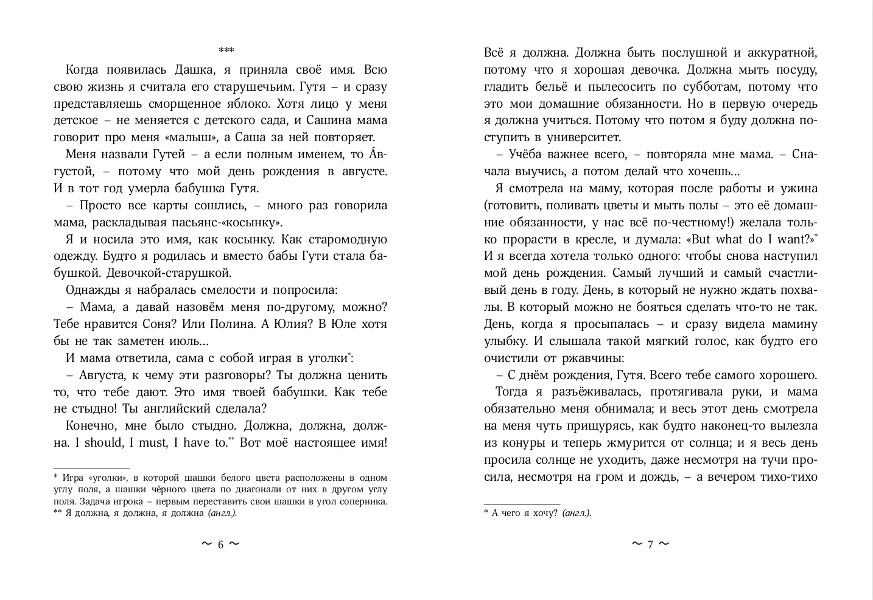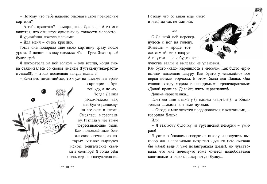 Так бывает — встречаются и начинают дружить удивительно непохожие люди. Гутя всегда вежлива и послушна, отлично учится, правильно питается и держит осанку. Хорошая девочка, которая больше всего на свете боится нарушить правила хороших девочек. Дашка живёт нараспашку: хохочет и поёт, здоровается с каштанами, наволочки превращает в птиц, а дорогу до школы — в приключение. Раздаёт печенье прохожим — просто так. Просто так щедро и увлечённо живёт, как будто торопится побольше успеть. Удивительно непохожие. Но их дружба оказывается сильнее предубеждений, слабости, боли и даже страха.